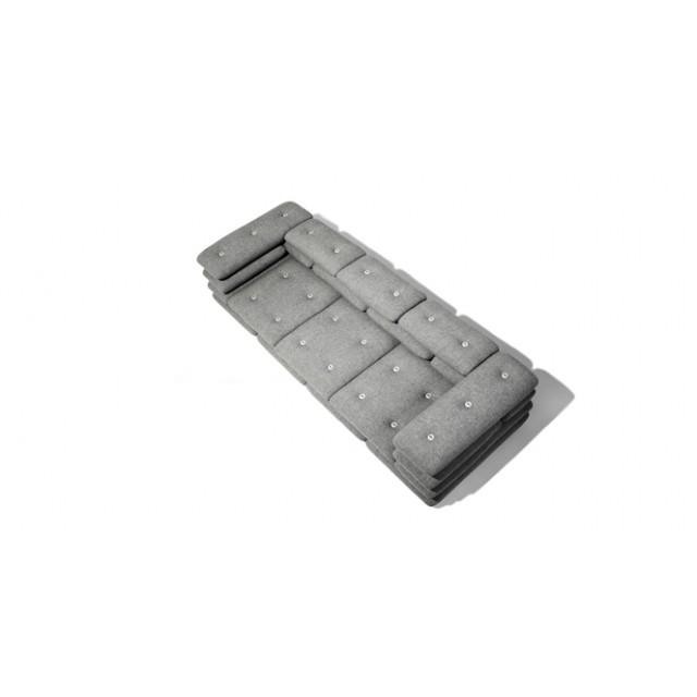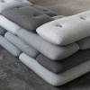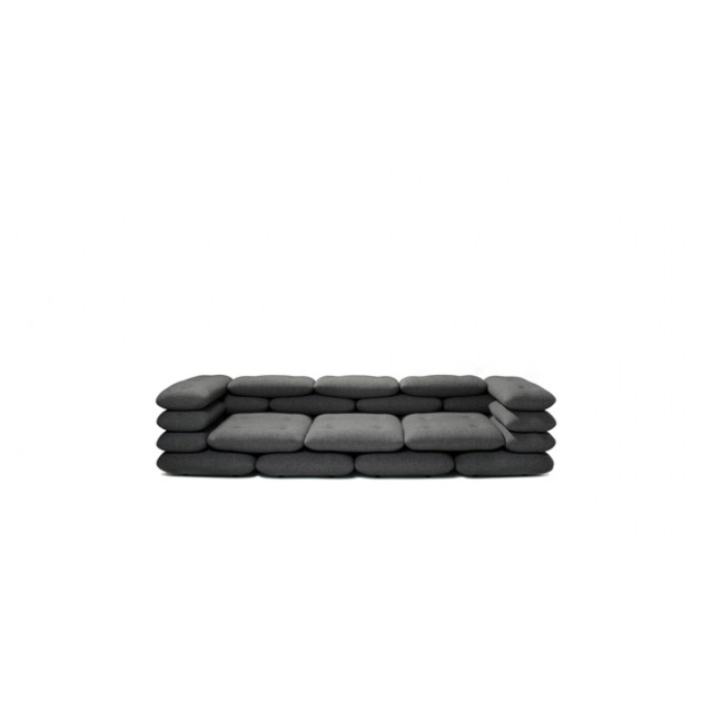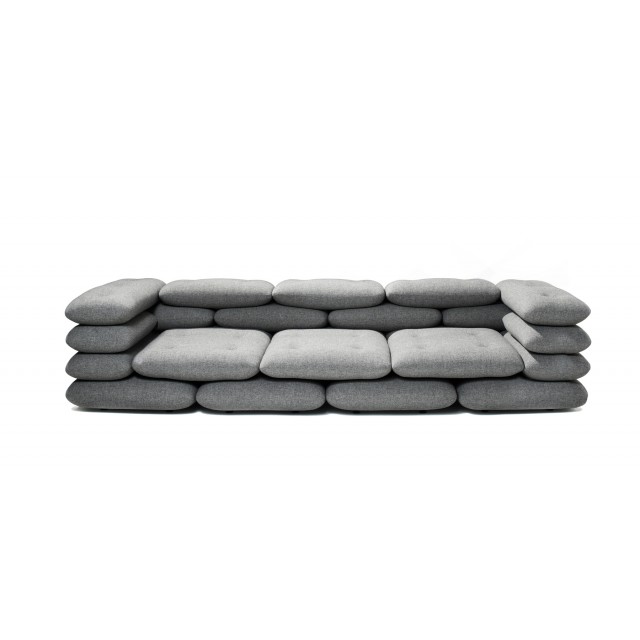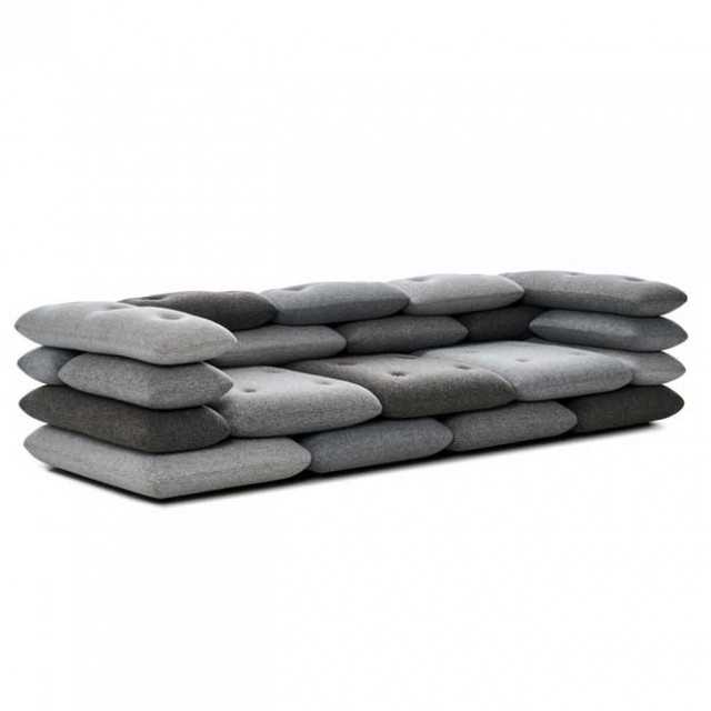 콘크리트 벽돌이 겹쳐져 있는 듯 쌓아올린 쿠션 패턴이 디자인의 포인트인 이 소파의 쿠션과 쿠션의 연결은